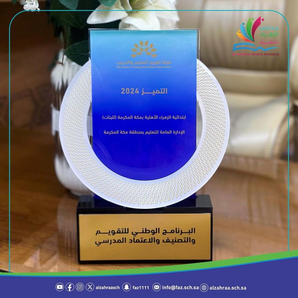 حصول ابتدائية الزهراء الأهلية على فئة التميز2024 على مستوى المملكة في التقويم المدرسي
